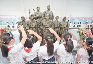 8月28日,小学生在合肥青龙厂新四军纪念园中的“抗日战争纪念馆”向英烈雕像敬礼。