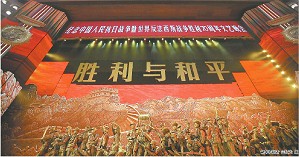 3日晚,习近平等党和国家领导人与数千名中外人士一起观看文艺晚会《胜利与和平》,以此纪念中国人民抗日战争暨世界反法西斯战争胜利70周年。