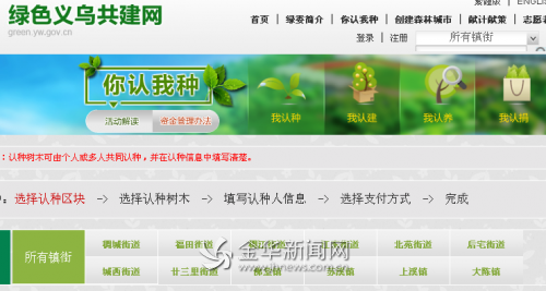 义乌市绿委会推出的“绿色义乌共建网”,为市民认种认捐认养树木提供了很大的便利,只要在家点点鼠标,支付一定费用,就可以在义乌各镇街任意认种一棵树木、认建一块绿地、认捐绿化造林资金。