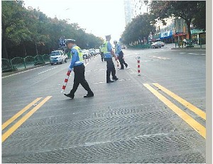 10月18日下午3点40分左右,记者在现场看到,路面有三四个协警员正在搬移移动警示柱。“这些移动警示柱每天要搬移4次,每次要花费半个小时左右时间。为此,我们每天派出了5名警力,同时负责日常巡查、路口交通秩序管理等。”市交警大队城区二中队中队长高永军介绍说。