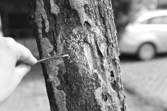 前天,在义乌望道路与雪峰路交叉口附近,有五六棵樟树树干已被白蚁“剥皮”,有的甚至被蛀空。树干上类似于蜂巢的土块,用手轻轻一掰就碎成两块,土块内部全是密密麻麻的白蚁。