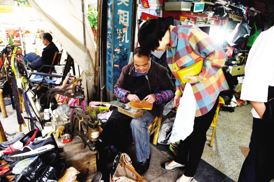 昨天,在义乌湖清门一带修鞋已有26年的金兴林正在帮客人修补鞋子。 老金说,以前有个在美国做生意的义乌人,回国时带来30多双鞋子让我修补。义乌人不管生意做得再大,艰苦朴素的传统一直保留着。 除了本地人、外地人,一些在义乌的外国人也常来找老金修鞋子,老金不懂外语,就靠比手画脚来沟通。
