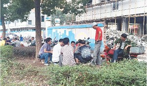 一群工人坐在绿化带上。