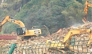 中国义乌网11月15日讯(义乌商报记者 朱葵阳)昨日中午,一支由16人组成的义乌紧急救援队与两台大型挖掘机,紧急赶赴丽水,参加救援活动。一小时后第二批队员20人赶赴丽水。图为义乌紧急救援队的两台挖掘机在丽水莲都山体滑坡现场救援。