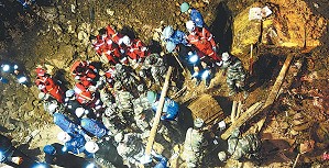 义乌的抢险队员们都已疲惫不堪,好想美美地睡一觉,但是他们不能。有3名队员原来打算要赶回义乌办事,有的队员晚上12点还要上班,有的家里有重要事情需要处理,可是他们好像都事先商量好似的,自觉拧成了一股绳,稍微休整半小时之后,又冲入现场抢险。他们知道,在一个小时之前,义乌救援队员与消防队员从刚10多米深的地下救出2名村民,可是还有30多名村民失联,这时决不能退出“火线”!