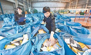 昨日下午,在义乌跨境电子商务监管中心,义乌海关工作人员正对出口美国、俄罗斯等地的包裹进行分类查验。当日,该中心跨境出口包裹通关数量超过12万件。