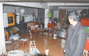 昨天早晨6点半,记者在现场看到,渡槽与六都新村间的通道上,浑浊的泥水不停地朝着村北方向流淌。据了解,这股泥水首先冲进68幢陶宗永家的车库内,水位起码有20厘米。该车库是点钻的作坊,里面的布匹、点钻产品等都被淹。六都新村77号陈登茂家的车库也同样遭殃,水位有40多厘米,里面的注塑机和产成品都被淹。