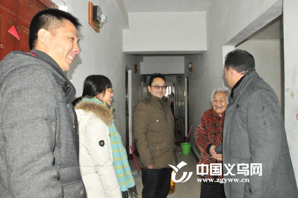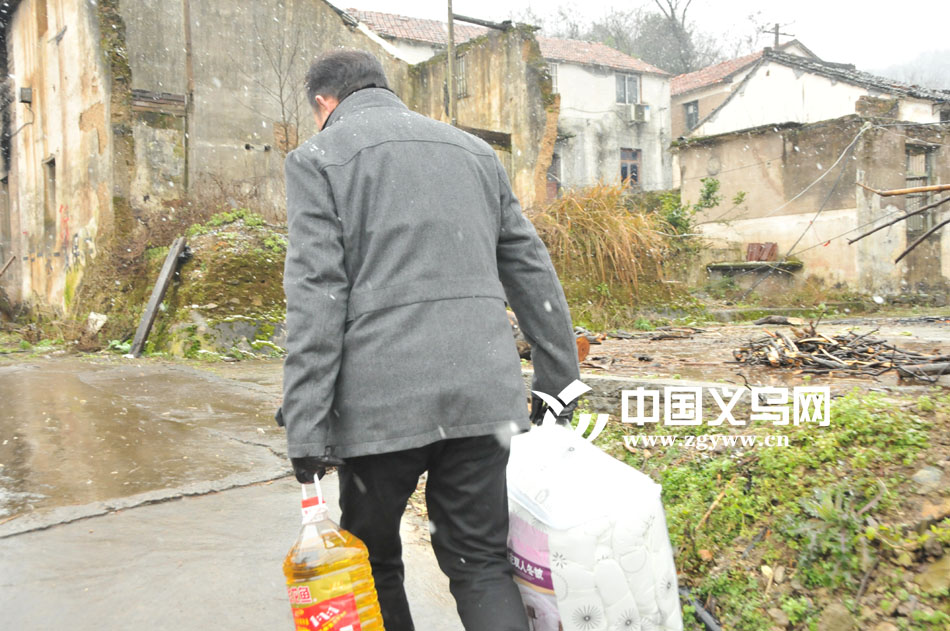 中国义乌网1月21日讯(通讯员 毛雪丹)1月21日,当义乌城区的人们盼望着下雪的时候,位于义乌北部的大陈镇已经飘起了鹅毛般的雪花,考虑到一些孤寡老人的保暖问题,大陈镇红旗村的两委干部在两天前去走访以后,又到超市临时买了米、油、棉被等物资,冒着暴风雪,去走访了4户独自在家的孤寡老人。