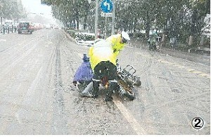 1月21日晚开始,我市雨雪交加,一直下了2天,低温冰冻天气紧随其后。连日来,无论是在雨水中、还是在飘扬的雪花下,无论是白天还是深夜,交警值守在各个路口,亮黄色的雨衣显得格外醒目。
