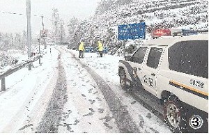 交警对部分积雪严重路段进行封道。