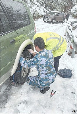 巡查交警帮助车辆装上防滑链。