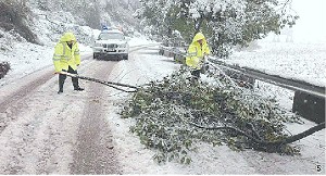 山区道路压断树枝阻挡道路畅通,交警立即进行清理。