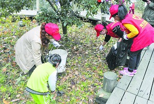 图为小朋友们手拿钳子,将隐藏在角落里的矿泉水瓶、塑料袋等垃圾捡出来。