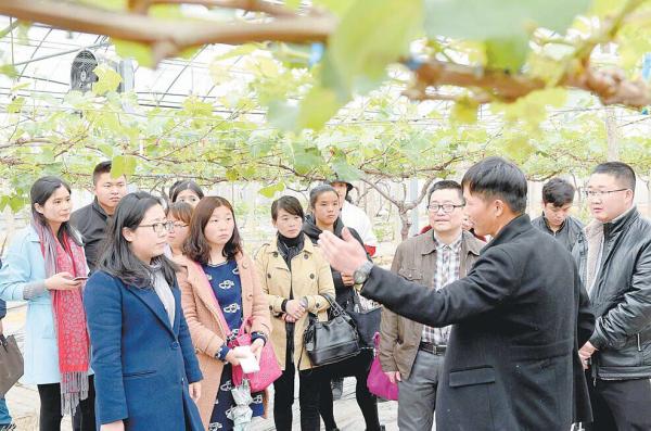 中国义乌网3月30日讯(义乌商报记者 龚献明)“对新梢过多的植株,要疏除一部分,以利通风透光;在定梢时,要把生长过密、发育不良的枝条尽早抹除,留强壮枝条,这样才能长出大粒葡萄。”最近,50余名就读于浙江农林大学的省现代农业经营领军人才提升班学员,在我市金萱农庄现场学习交流葡萄疏花、定梢技术。该农庄采用的先进种植技术,让学员们大开眼界。
