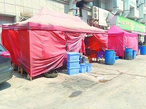 银海一区就坐落在繁华的国际商贸城对面,这里各种各样的餐馆每天都能吸引到许多外国、外地客商。但这些装修精美的餐馆后门是什么样的呢?记者在银海一区6幢和7幢之间看到,几家餐馆都在后门搭起了红色的雨棚,而雨棚里面就是“厨房”,一个个大大的脸盆里放满了锅碗瓢盆,洗过餐具后的污水慢慢地流向绿化带边的水箅里(水箅是用于收集路面雨水的)。
