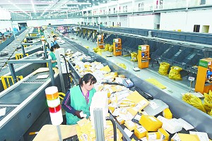 4月23日晚,义乌国际邮件互换局灯火通明,工作人员加班加点,对跨境邮件进行分拣。吕斌摄