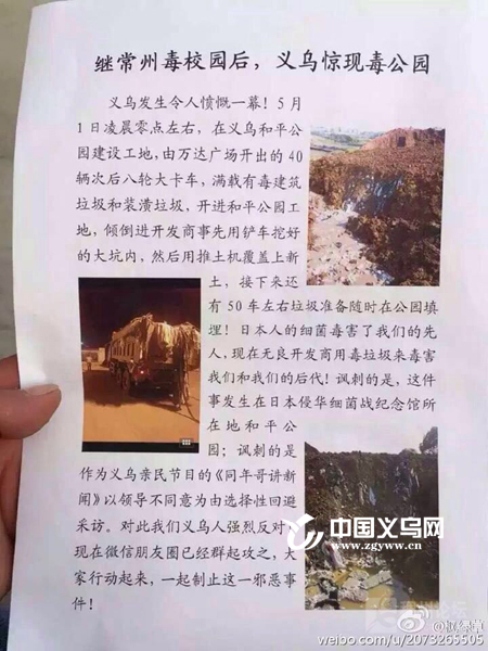 中国义乌网5月6日讯(通讯员 王姝岩)这几天,一则《继常州毒校园后义乌惊现毒公园》的帖子引起网友的关注。发帖者称:“5月1日零点左右,由义乌万达广场开出的40辆次后八轮大卡车,满载有毒建筑垃圾和装潢垃圾,开进义乌和平公园工地,倾倒进开发商事先挖好的大坑内,然后用推土机覆盖上新土,接下来还有50车左右的垃圾准备随时在公园填埋。讽刺的是,这件事发生在日本侵华细菌战纪念馆所在地——义乌和平公园。”