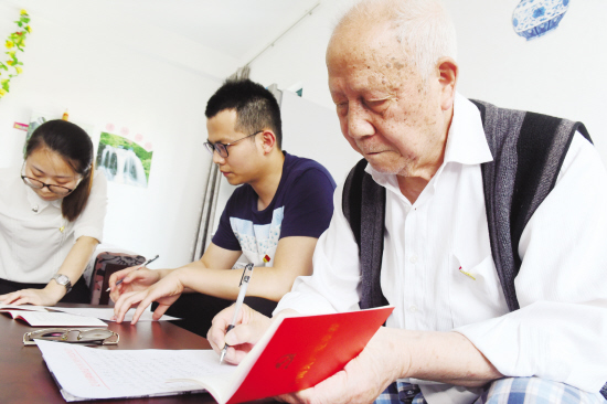 为扎实开展“学党章党规、学系列讲话、做合格党员”的学习教育活动,昨天义乌稠城街道下车门社区的党员、预备党员来到辖区内84岁老党员楼建伟住处,和老人一起学习《中国共产党章程》,一笔一画认真抄写党章。楼建伟的桌上摆满了他一本本手抄本。