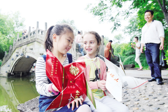 外籍学生和中国学生在一起快乐地玩耍