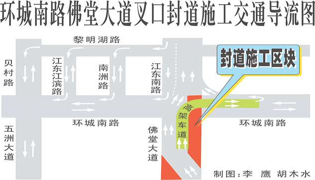 Ⅱ标段实行封道施工后,佛堂大道入城方向的车辆有两种改道通行途径:其一,改道至左侧穿过环城南路交叉口后,直接沿江东南路入城;其二,改道至高架桥,然后右转进入环城南路,再调头回到江东南路入城。