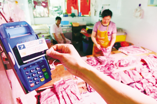 昨天,在义乌词林菜市场,一位市民使用银联卡通过POS机闪付菜钱。16号摊位的摊主成品海告诉记者,使用POS机后,顾客不需要带现金,他们也解决了找零的麻烦。据了解,该菜市场内近百个POS机从4月底开始安装,现在已经陆续投入使用。