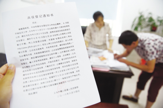 昨天,家住义乌凤凰社区的陈先生来到凤凰社区居委会,为其刚结束高考的儿子领取《兵役登记通知书》。 据了解,根据国务院、中央军委在全国征兵工作会议精神,6月起开始征兵工作。凡今年12月31日以前年满18周岁的男性公民,都应当在今年6月30日以前,按照兵役机关的安排进行兵役登记。于6月10~25日在网上办理网上兵役登记手续。