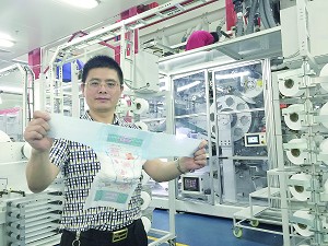 叶文忠认为,相比国外大品牌来说,我国企业生产纸尿裤的经验还不足,通常是在模仿、学习国外的产品,没有真正去分析各种材料的性能、研究各种材料的搭配、研究设备的原理。“华丽达”从一开始就做足了功夫,不到四年的时间,纸尿裤专利已拿了2个。比如纸尿裤的侧漏问题,“在反复测试的过程中,发现水从立体护围的位置漏出来,后来和各供应商交流发现面层亲水剂的转移造成拒水布不拒水,使纸尿裤发生侧漏。”叶文忠说,纸尿裤的面层是亲水的,立体护围是拒水的,把立体护围与面层压合在一起,在一定的温度和湿度的情况下,亲水剂会转移到立体护围上,使其变成亲水的,造成漏尿。找出了问题的真正原因,企业对原有设备进行改造,使立体护围与面层材料零接触,这样就解决了侧漏问题。
