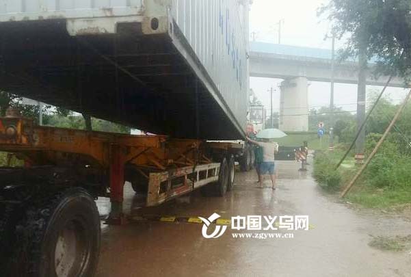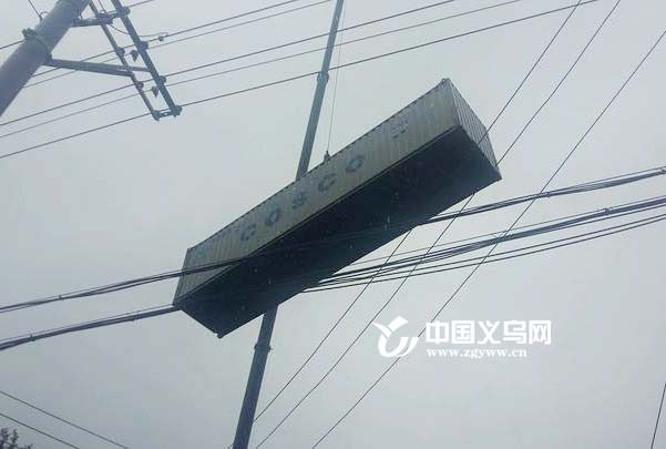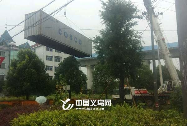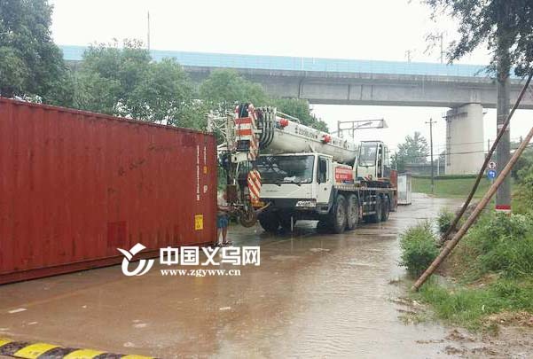 中国义乌网6月27日讯(通讯员 周侠波)6月26日,大雨瓢泼,大型吊机如期来到城西街道上杨村,成功将散落在高铁沿线的18只集装箱一一吊离。