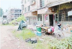 “厅房”门前东侧,有一堵断墙连着一幢破旧民房。穿过断墙门,只见门框里面靠墙壁堆着一大堆破旧衣物。往东再走几步,只见旧民房东北角用木板围着一个院子,透过木板缝隙,可看见里面堆满了各种废品。