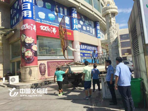 中国义乌网7月21日讯(通讯员 黄志平)随着台风季节的到来,为了保障市容市貌的整洁,消除存在的安全隐患,7月20日,执法局福田大队动用大型机械,对位于福田路国际商贸城三区的京龙世贸大厦(宝德大厦)多处大型广告进行拆除,