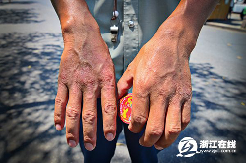 七夕情人节对断桥保安老于来说并不好过,杭州的最高气温高达39.2℃。在烈日下持续暴晒,老于的皮肤晒得通红,双手像起了鸡皮疙瘩一样密密麻麻的全是水泡。像老于这样在高温下工作的人不在少数,环卫工人、交警、建筑工人……热灾之中,他们为城市站好了自己的岗位,他们的要求不高,一瓶清水便是解暑降温的佳品。