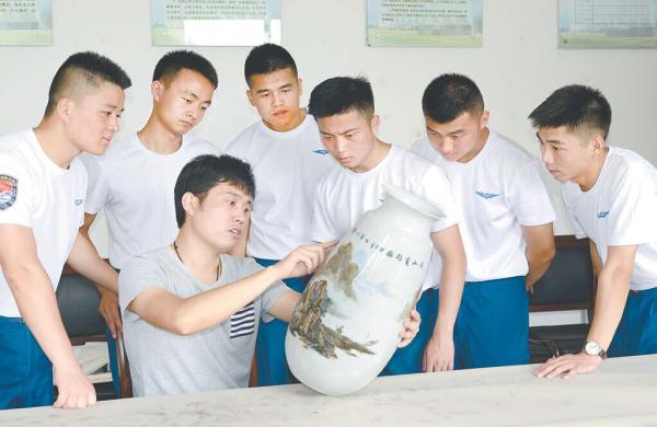 中国义乌网8月1日讯(义乌商报记者 吕斌 通讯员 卢国良)“八一”前夕,由市爱国拥军联合会牵头,著名陶瓷艺术家谢古道和青年书法家赵鹤松专程从外地赶赴驻义某部,将自己近期创作的陶瓷系列精品和书法作品捐赠给部队,拉开了知名艺术家“文化拥军”系列活动的序幕。图为谢古道为飞行员讲解陶瓷鉴赏知识。