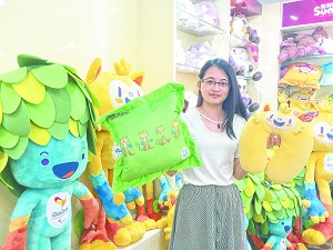 超其特工作人员在展示奥运吉祥物系列抱枕。商报记者王婷骆红婷摄