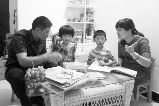 周末晚上,林优发和郑建娟给一双龙凤胎儿女讲故事。