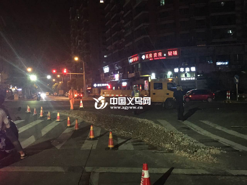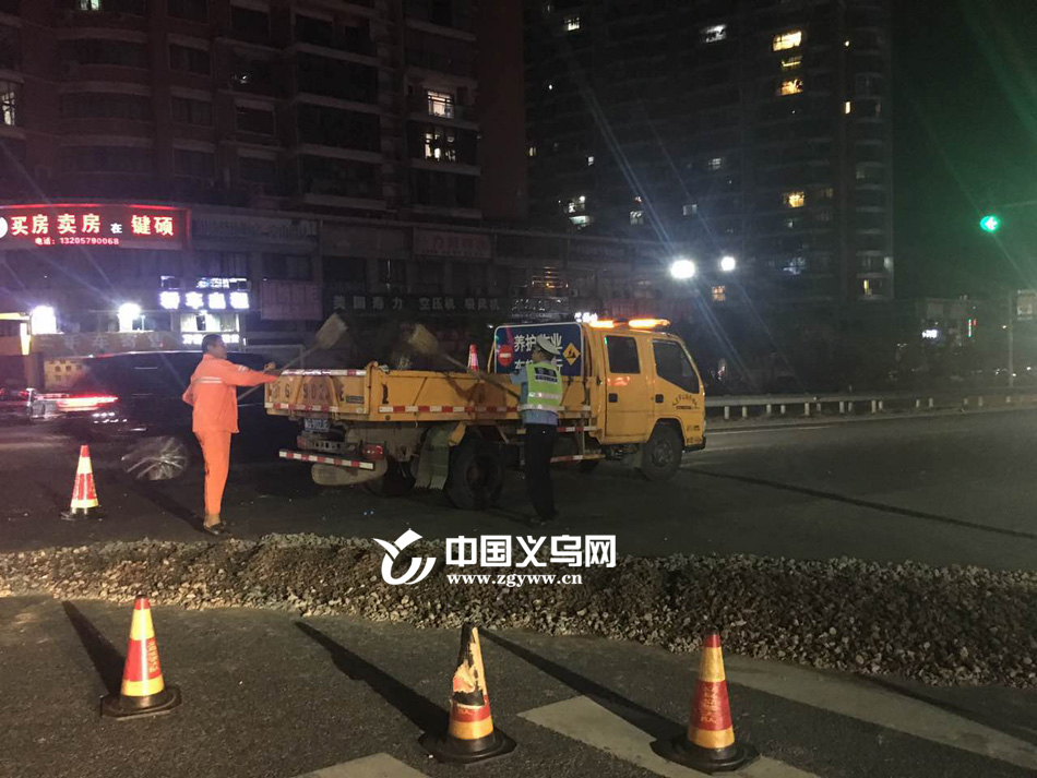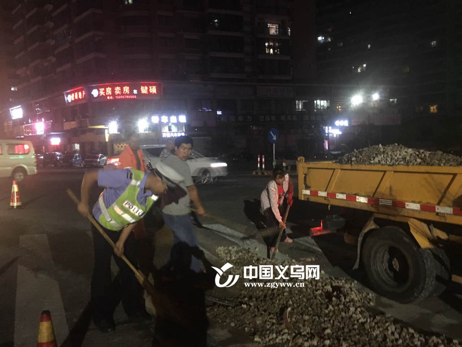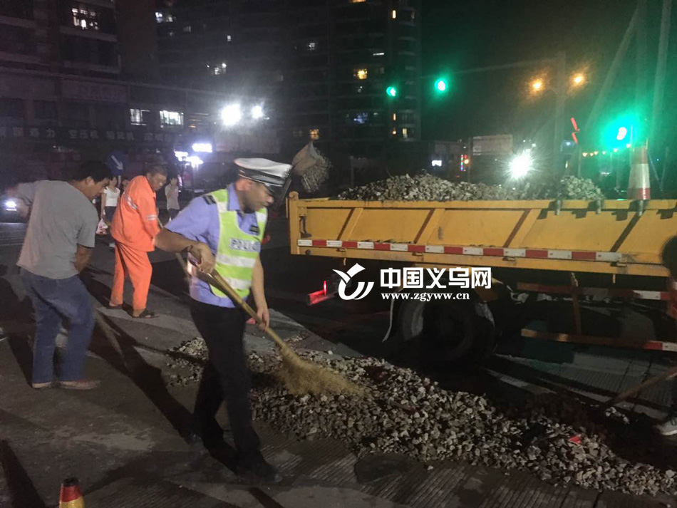义乌市交警大队苏溪中队巡逻民警接到报警后,迅速赶赴现场。在了解相关情况后,立即组织警员和警车,设置夜间警示桩,实施现场保护并指挥车辆有序安全通行。同时,民警立即联系交通部门,开展清理,经过1个多小时的清理,终于清除了路面碎石,恢复交通顺畅。