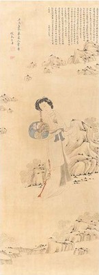 明清时期的才女倪仁吉,17岁嫁义乌大元村吴百朋曾孙吴之艺为妻。她通经史诗文,兼工书画刺绣。绘画精通山水、人物、花卉、走兽等,尤其善画美人,同时代人称“得其书画片羽者,皆珍若拱璧”。其展出作品《仕女图》描绘一位手执纨扇、侧身凝神独立、回首顾盼的青春少妇,仪态端庄稳重、温雅娴静。倪仁吉在用笔、着墨上恰到好处:长曳的衣裙略施白粉,线条清丽、流畅,犹如春蚕吐丝;纨扇、清荷重描细染,与素洁浅淡的衣着形成鲜明的对比;发髻用浓墨重染,衬托出细嫩、白皙的脸庞和清闲、安逸而略带忧思的神态;背景以几处疏落的坡石作点缀,增添了荒凉、冷落的幽静气氛。倪仁吉的绘画、刺绣、书法、诗歌等艺术品,历经岁月变迁,湮没不少。仅从其存世的部分作品中,我们便可以看到她超拔的艺术成就。可以说,她是义乌明清时期一位李清照式的传奇人物。