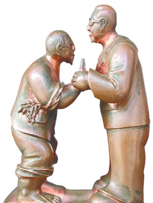 小小的木案桌上陈列着朱国平近些年的作品,数量不多,却件件是他对这个世界的所思所想。“你看这件作品,描绘的是2012年为60岁老人发放养老金的故事,当干部亲切地握着老人布满老茧的双手,将存折转交到他手中,老人饱经风霜的脸上洋溢着的笑容如孩子般纯真。”在朱国平的细心解说下,铜雕上镌刻的每一个场景都变得鲜活起来。