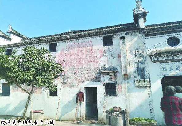 站在十八间前空阔的明堂上,正午的阳光刚好在整座古屋上空跳跃,错落有致的马头墙在空中勾勒出优雅的线条,黑白分明的色彩在冬阳里散发出别样的韵味;斑驳院墙上一幅幅人物花鸟山水黑白图画,意蕴丰富,形式多样,“大跃进”时期的宣传标语———“我国今年粮食总产七千亿斤以上”等,尚能看到痕迹,显现出当时人们的干劲和向往;石库门门楣上题写的“贻厥孙谋”、“兰芝并茂”等青石匾额,仍然铭刻着张氏祖先寄予子孙后代瓜瓞绵绵、流传万代之基业的厚望。