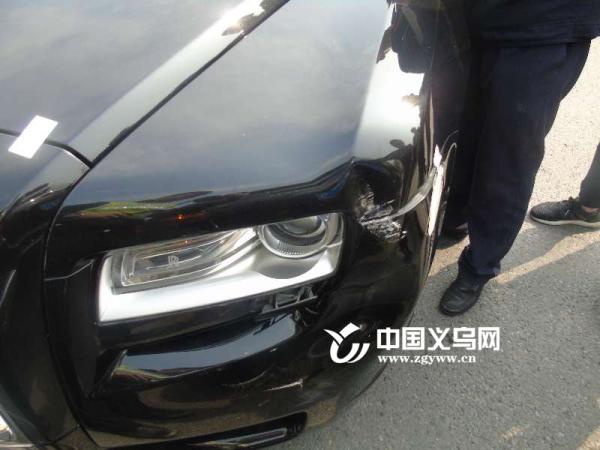 中国义乌网2月20日讯(记者 龚书弘 通讯员 何景飞)今天(2月20日)上午10点左右,在义乌市江东东路与阳光大道交叉口发生一起劳斯莱斯追尾丰田的交通事故,事故造成两车不同程度受损,劳斯莱斯车损近30万元。