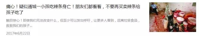 记者通过关键词搜索发现,早在2014年,上述谣言信息就曾以“昨日安徽小孩吃辣条死了三个”为标题出现,随后变换地名、医院名称等细节在广东、河北、湖南等多地传播。中国互联网举报中心在2014年朋友圈食品谣言盘点中就将此条信息列入排行榜,并指出这些吸引眼球的谣言,发布者大多是微信营销号,主要目的是吸引粉丝,为日后营销吸引人气。