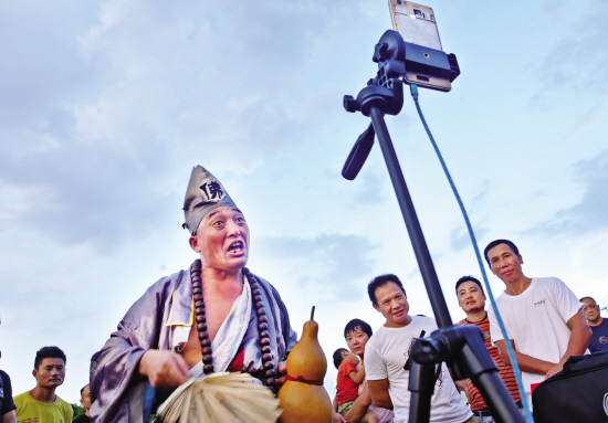 昨天(8月13日)傍晚6时许,义乌市民广场上的喷水池边围着不少人,他们正在观看吕玉柱做手机直播。吕玉柱身着“济公”服饰,一手拿破扇子,一手拿着葫芦,对着手机一边摆动作一边说:“谢谢大家的小礼物,感谢点亮……”他告诉记者,自己从小喜欢济公这个人物,去年9月28日,他穿着“济公”服饰从石家庄徒步到杭州,之后又来到义乌。他很喜欢义乌这座城市,这里的人很热情很友好,希望通过这种济公式幽默给大家带来快乐。