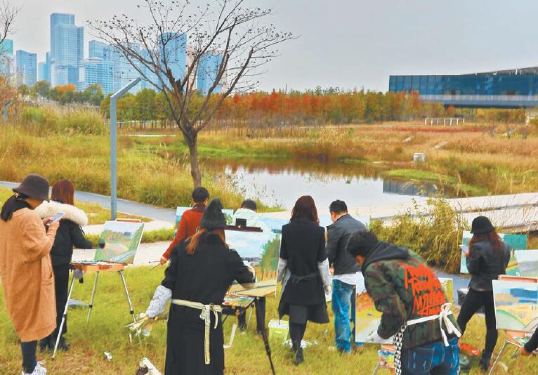 中国义乌网11月28日讯(商报记者 龚献明)漫步“空中栈桥”,远赏金融商务区挺拔的建筑群,近品茂林修竹及静静流水,倍觉心旷神怡……眼下,正是江滨绿廊观赏银杏、枫叶等美景的黄金季节,每天都吸引着众多市民前往休闲、观光,也吸引着一些美术爱好者的驻足。他们以手中的画笔,画出了一幅幅生态品种丰富、文化特色浓郁、湿地景观突出、趣味娱乐性强的城市湿地公园美景。
