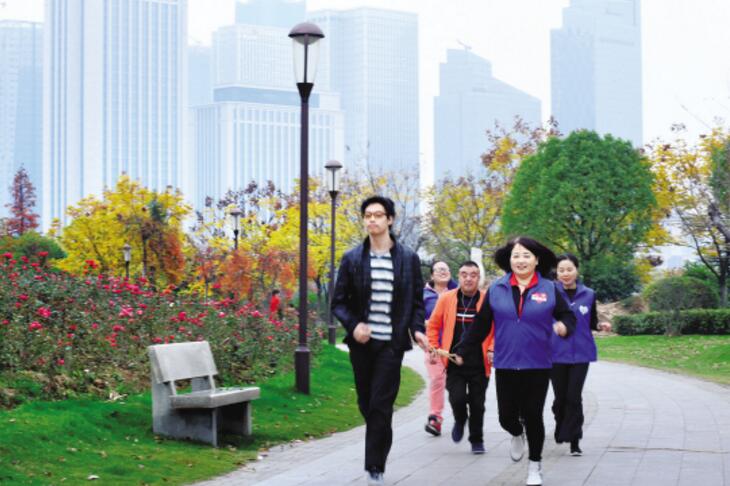 昨天是世界残疾人日。两名“爱无障碍”跑团的视障跑者在义乌市寄语未来公益志愿者协会志愿者的带领下,在义乌国际雕塑公园进行跑步训练,为本周日的在永康举行的马拉松赛做赛前准备。