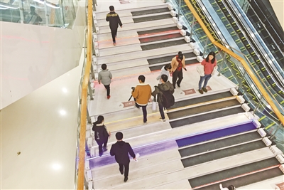 1月15日,记者在义乌一家商场看到,一个出口的楼梯作了“改装”,楼梯上安装了压力传感器,楼梯则漆成钢琴的琴键一样。传感器与扬声器相连,人们每走一个台阶就相当于按下一个琴键,扬声器就会播放相应的音调,让人感受到运动和美妙音符相联所带来的快乐。