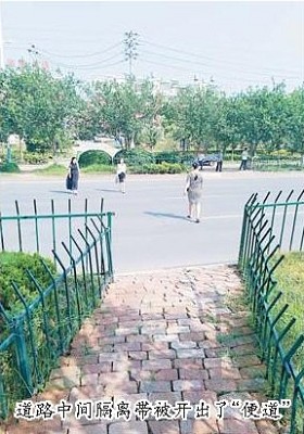 “不光这里被开出了缺口,那边也有!”依据行人反映,我们沿五洲大道往上佛路方向前行不到300米,来到了新屋三街段。我们看到,主道与辅道之间的绿化带被人“走”出了三条小道,在对面路中间的隔离绿化带上,有人将隔离护栏拆出了一个“口子”,通向对向的车道。站在路边,我们看到不时有行人在马路上穿行,通过路中间的绿化带走到道路对面,而路面上也没有设置斑马线。这时,刚好有两名行人一前一后走向道路中间,而此时,行人左侧、从环城南路方向过来的车辆正快速驶来,两人一溜小跑来到护栏前,车辆几乎贴着他们的身体疾驰而过。据这两名行人介绍,他们在对面的工厂上班,因为这里没有人行横道,若往环城南路交叉口方向走,要过一个红绿灯再绕到对面,需要七八分钟;如果从右侧的人行横道过马路,要向西走个10多分钟,过斑马线再绕到对面至少要20分钟时间,早晨急着上班时间紧,这样“跑”过马路虽然危险,但快多了,也方便多了!