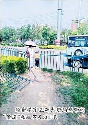 其实,早在去年,本报“监督台”栏目、商报市民监督团就对五洲大道新屋段,行人走“捷径”险象环生进行了关注,有关方面及时采取了封堵、疏导等措施。然而,当昨天上午记者一行再次来到现场,竟发现该路段又多了几条横穿马路的通道,现场不时上演人车抢道的场景。