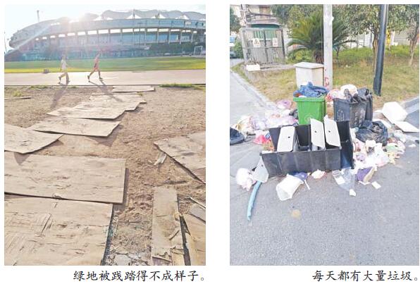 我们来到室外足球场段,只见地面及通道两侧的绿地上到处都散落着各种垃圾。一侧,有一大片草坪,不少饮料瓶、瓜果皮、纸屑、包装袋散落在草坪上。一些树下的草地上,也散落着果壳、瓜皮等。在通道尽头,烟头、饮料瓶、瓜子壳等垃圾随处可见,显得格外刺眼。随后,我们进入室外足球场,在球场的草坪边、跑道上也发现有各种垃圾。除此之外,球场四周的绿地已经被人踩成了“黄土地”,不少垃圾飘落其中。现场,不少晨练的市民说,每天一到晚上,梅湖体育中心就“人满车满”,热闹异常,大量的市民或驾车或步行来这里纳凉、休闲、健身。火爆的人气也吸引了很多流动摊点在这里集聚。还有一些人将车子开上人行通道,压坏了路面,毁坏了绿化,更有不少人随手乱丢垃圾,弄得体育中心又脏又乱,让人心里很不舒服。“现在来这里玩的人太多了,垃圾也比之前多出好几倍。”正在现场清扫垃圾的环卫工人告诉记者,他们每天打扫时都会发现草地上有各种垃圾,工作量比之前增加很多。有市民表示,这里是公共场所,有了良好的环境,大家休闲游玩才能开心和尽兴,像这样满地都是垃圾,确实让人扫兴。