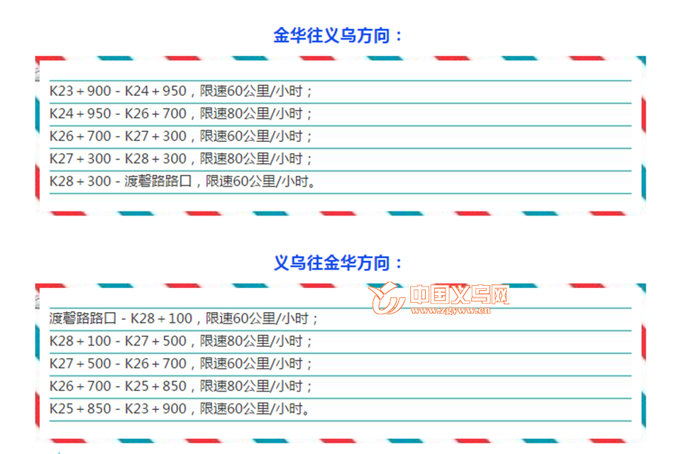 中国义乌网7月30日讯(记者 龚书弘 通讯员 楼登 编辑 童荟颖)今天(7月30日讯)下午,记者从义乌市公安局交管分局获悉,作为一级公路的金义东公路佛堂段(K23+900一渡磬路),双向四车道,沿线有泽塘、葛仙、金山,埠头、倍磊、芦塘下、后阳、后塘、新店等农村,行人横穿需求较大,原道路限速在部分路段为100公里/小时,为预防发生重大交通事故,确保交通安全,经公安交警和公路管理部门充分论证,将对该路段道路限速进行调整。