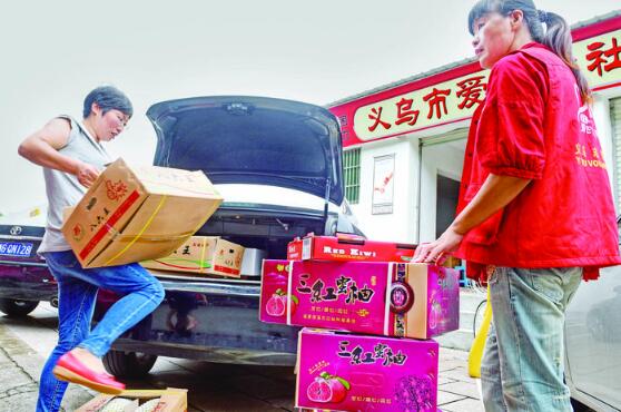 9月12日,家住义乌江南社区的洪女士和邻居一起来到位于赵宅路上的义乌爱心公社仓库购置爱心水果。据悉,随着中秋佳节临近,爱心公社从新疆购置了520箱哈密瓜,不仅是为了帮助新疆的瓜农拓展销售渠道,同时所获盈利部分将作为爱心基金,供将来各项公益活动所用。3天时间内,已经有300多箱哈密瓜被爱心人士购买。据了解,在这些爱心水果中,还有猕猴桃、红心柚、石榴、芒果、雪莲等,价格很实惠。