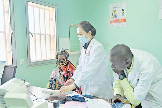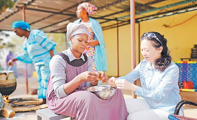 唐咏梅(右一)在义诊时与马里妇女交流谈心。
